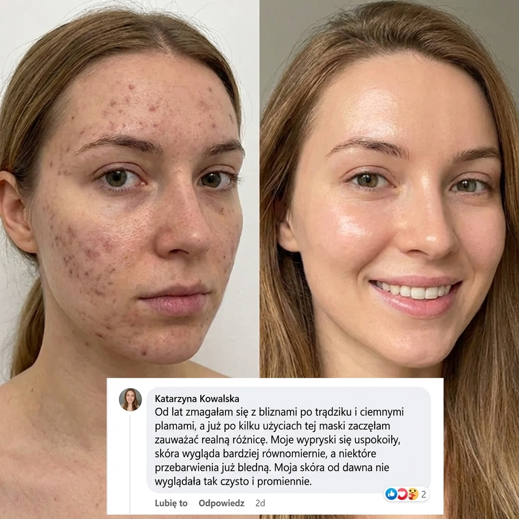 Kupowałam sceptycznie, bo już tyle rzeczy próbowałam i nic. Ta maska to zupełnie inne odczucie po przebudzeniu — skóra nie jest ściągnięta, jest po prostu miękka i jaśniejsza. Dwie tygodnie używam i już zamówiłam drugie opakowanie.